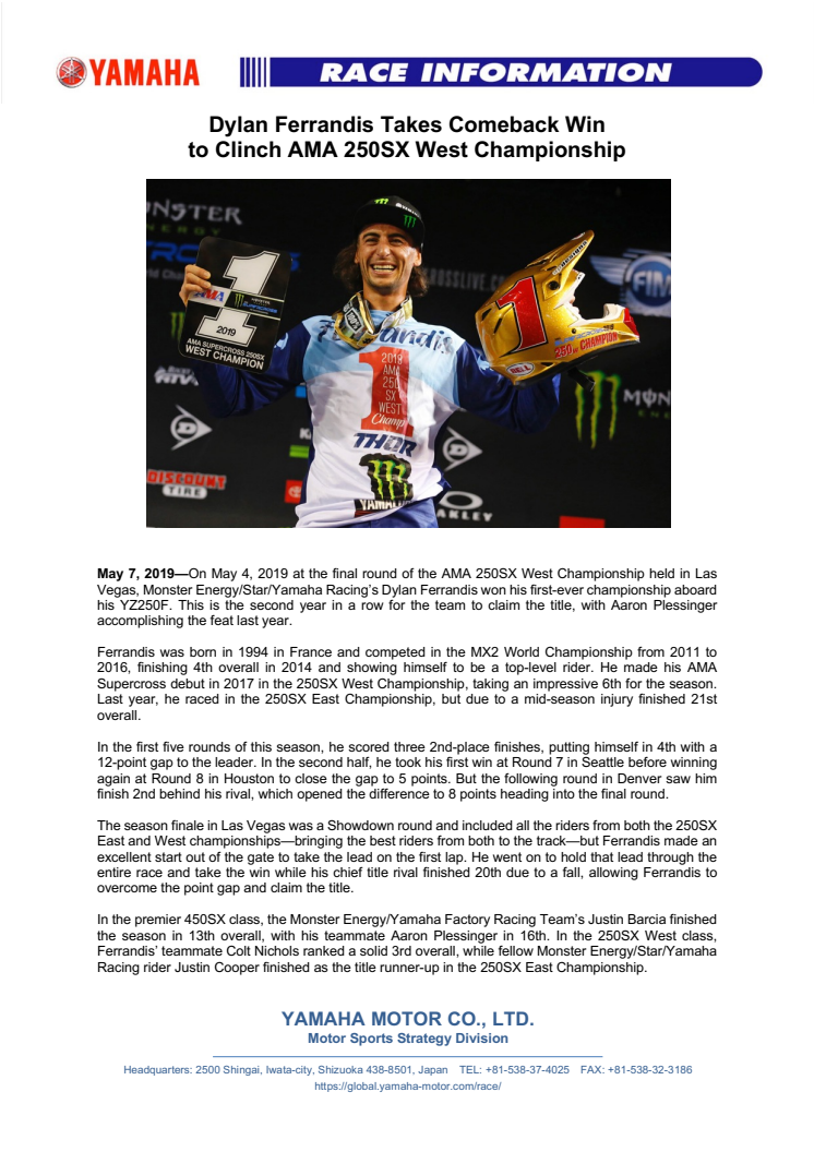 Dylan Ferrandis Takes Comeback Win to Clinch AMA 250SX West Championship