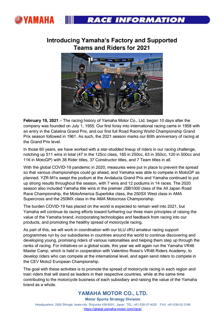 Introducing Yamaha’s Factory and Supported Teams and Riders for 2021