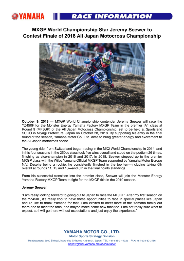 MXGP World Championship Star Jeremy Seewer to Contest Finale of 2018 All Japan Motocross Championship