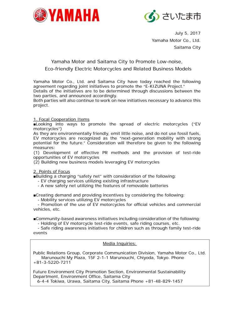 Yamaha Motor and Saitama City to Promote Low-noise, Eco-friendly Electric Motorcycles and Related Business Models