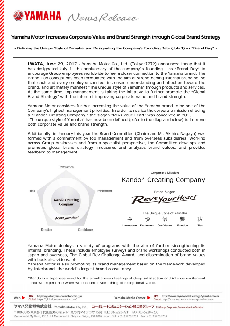 Yamaha Motor Increases Corporate Value and Brand Strength through Global Brand Strategy - Defining the Unique Style of Yamaha, and Designating the Company’s Founding Date (July 1) as “Brand Day” -
