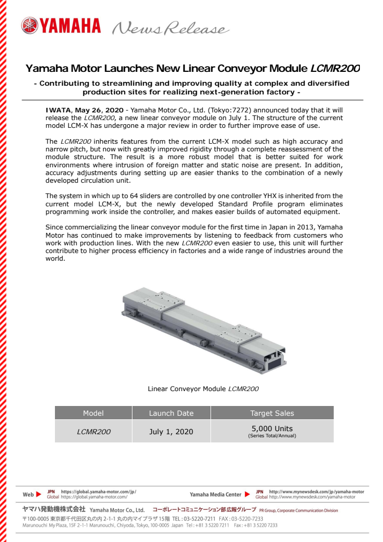 Yamaha Motor Launches New Linear Conveyor Module LCMR200 - Contributing to streamlining and improving quality at complex and diversified production sites for realizing next-generation factory -