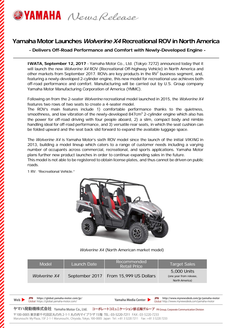 Yamaha Motor Launches Wolverine X4 Recreational ROV in North America - Delivers Off-Road Performance and Comfort with Newly-Developed Engine -
