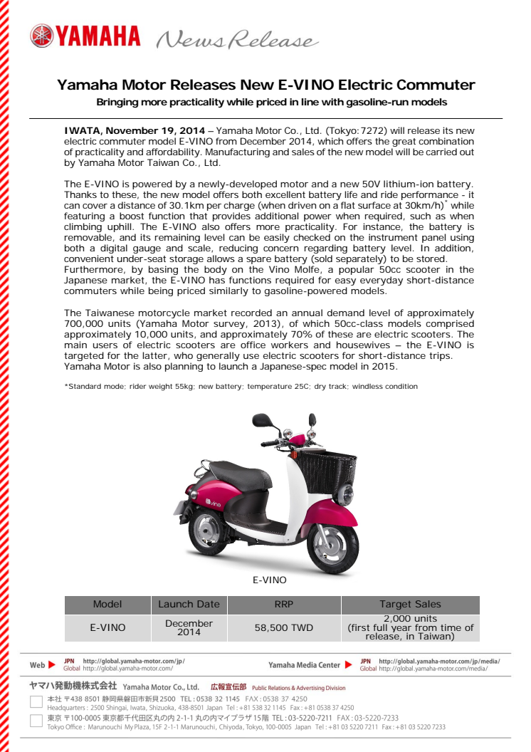 Yamaha Motor Releases New E-VINO Electric Commuter ~Bringing more practicality while priced in line with gasoline-run models