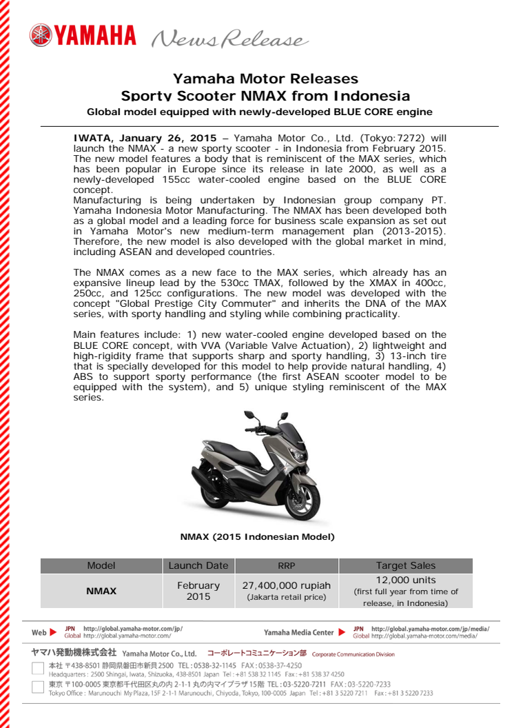 Yamaha Motor Releases Sporty Scooter NMAX from Indonesia ~ Global model equipped with newly-developed BLUE CORE engine