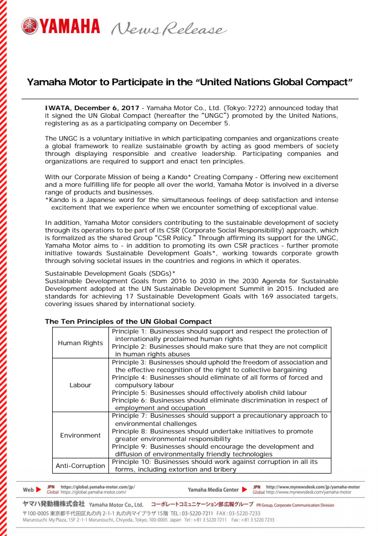 Yamaha Motor to Participate in the “United Nations Global Compact”