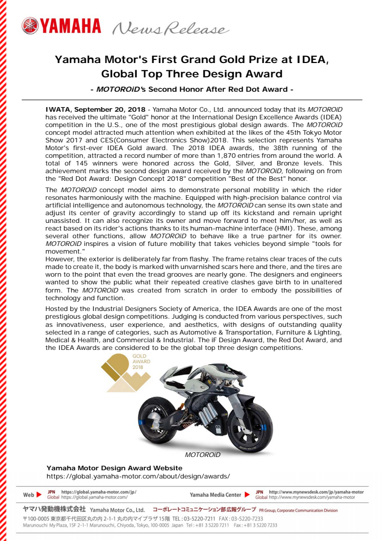 Yamaha Motor's First Grand Gold Prize at IDEA, Global Top Three Design Award - MOTOROiD's Second Honor After Red Dot Award -