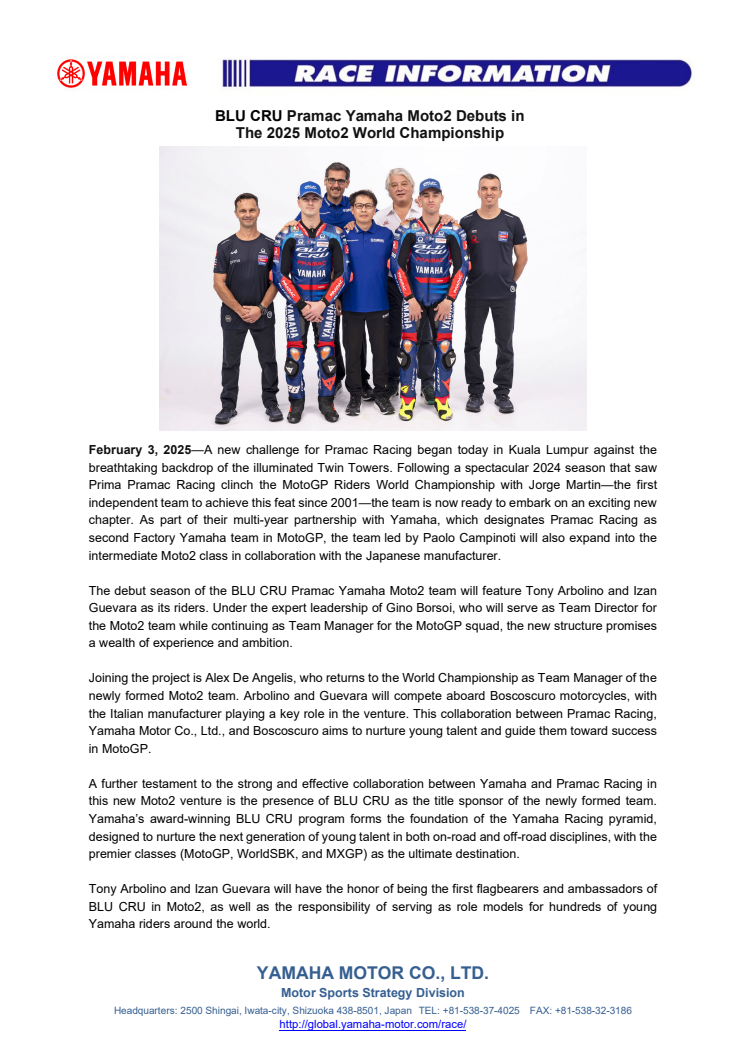 A further testament to the strong and effective collaboration between Yamaha and Pramac Racing in this new Moto2 venture is the presence of BLU CRU as the title sponsor of the newly formed team. Yamaha’s award-winning BLU CRU program forms the foundation of the Yamaha Racing pyramid, designed to nurture the next generation of young talent in both on-road and off-road disciplines, with the premier classes (MotoGP, WorldSBK, and MXGP) as the ultimate destination.
