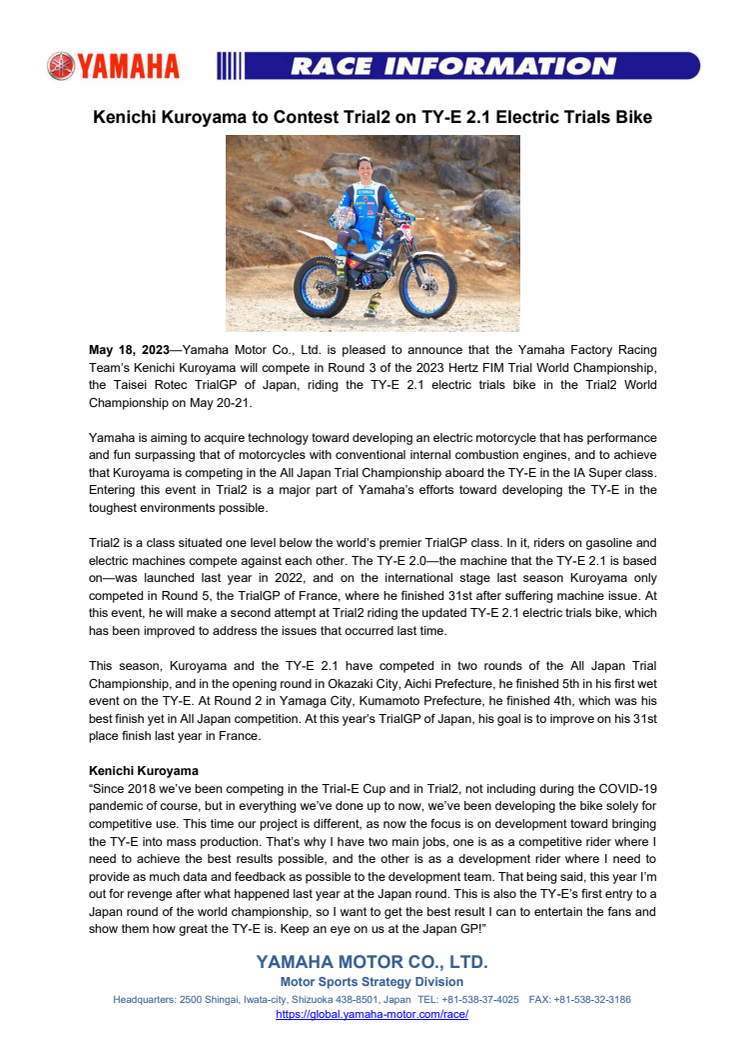 May 18, 2023—Yamaha Motor Co., Ltd. is pleased to announce that the Yamaha Factory Racing Team’s Kenichi Kuroyama will compete in Round 3 of the 2023 Hertz FIM Trial World Championship, the Taisei Rotec TrialGP of Japan, riding the TY-E 2.1 electric trials bike in the Trial2 World Championship on May 20-21.