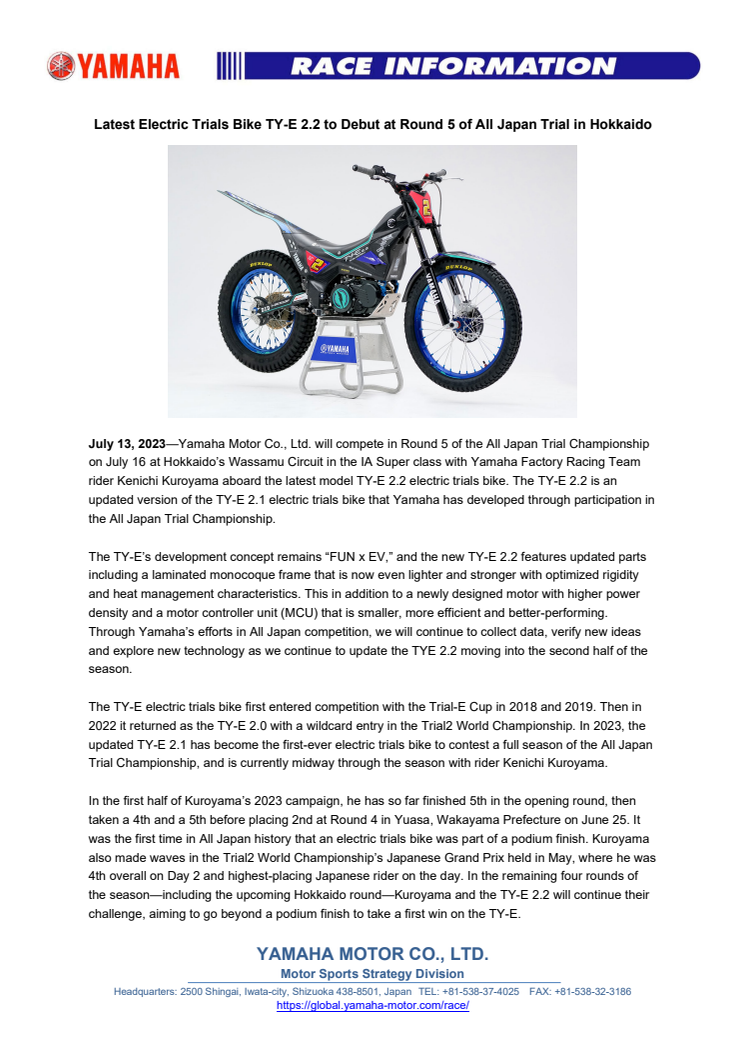 July 13, 2023—Yamaha Motor Co., Ltd. will compete in Round 5 of the All Japan Trial Championship on July 16 at Hokkaido’s Wassamu Circuit in the IA Super class with Yamaha Factory Racing Team rider Kenichi Kuroyama aboard the latest model TY-E 2.2 electric trials bike. The TY-E 2.2 is an updated version of the TY-E 2.1 electric trials bike that Yamaha has developed through participation in the All Japan Trial Championship.
