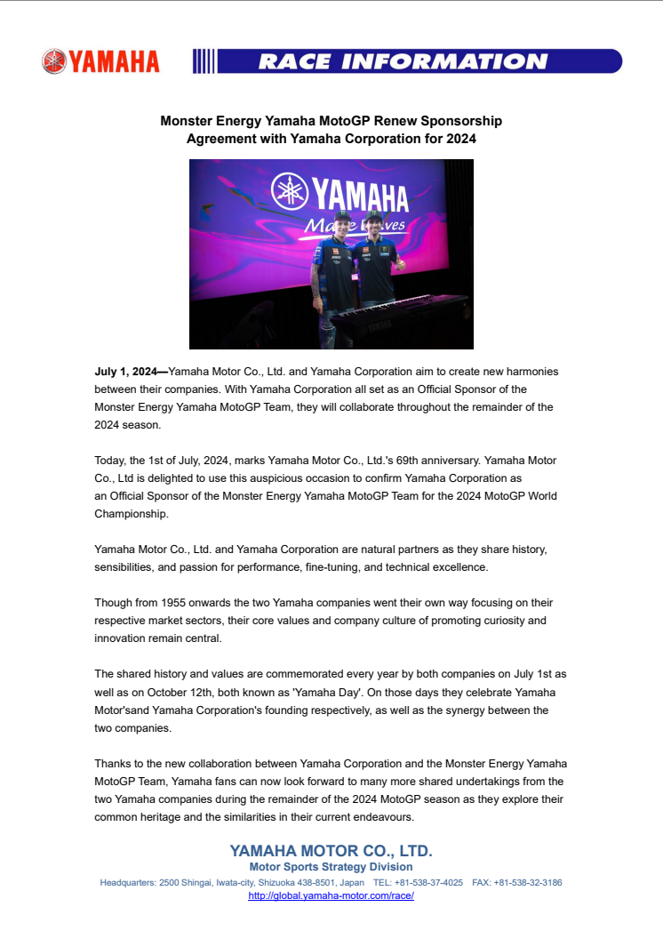 Today, the 1st of July, 2024, marks Yamaha Motor Co., Ltd.'s 69th anniversary. Yamaha Motor Co., Ltd is delighted to use this auspicious occasion to confirm Yamaha Corporation as an Official Sponsor of the Monster Energy Yamaha MotoGP Team for the 2024 MotoGP World Championship.