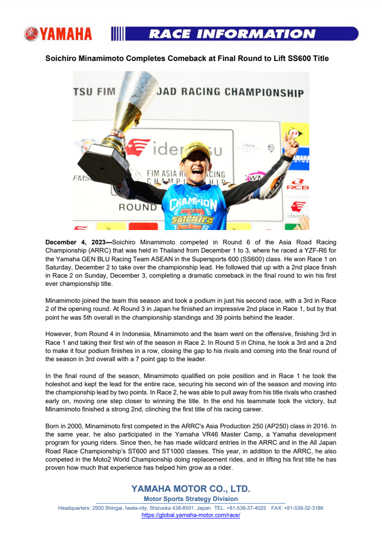 December 4, 2023—Soichiro Minamimoto competed in Round 6 of the Asia Road Racing Championship (ARRC) that was held in Thailand from December 1 to 3, where he raced a YZF-R6 for the Yamaha GEN BLU Racing Team ASEAN in the Supersports 600 (SS600) class. He won Race 1 on Saturday, December 2 to take over the championship lead. He followed that up with a 2nd place finish in Race 2 on Sunday, December 3, completing a dramatic comeback in the final round to win his first ever championship title.