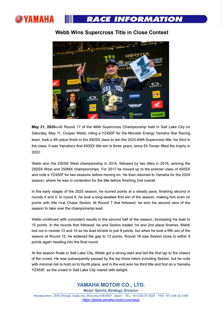 May 21, 2025—At Round 17 of the AMA Supercross Championship held in Salt Lake City on Saturday, May 11, Cooper Webb, riding a YZ450F for the Monster Energy Yamaha Star Racing team, took a 4th place finish in the 450SX class to win the 2025 AMA Supercross title, his third in the class. It was Yamaha’s first 450SX title win in three years, since Eli Tomac lifted the trophy in 2022.