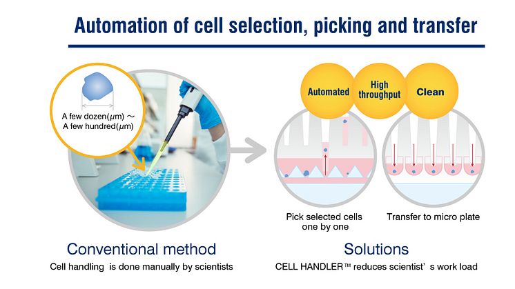 CELL HANDLERTM enables one-by-one selection of target cells and transfers them to a microplate (e.g. 384-well), while simultaneously capturing/digitalizing images – a process that was very difficult with high throughput and accuracy using the conventional manual method.