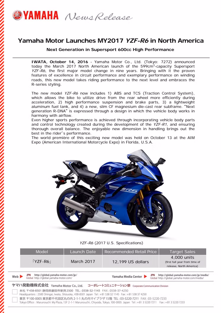 • Yamaha Motor Launches MY2017 YZF-R6 in North America -Next Generation in Supersport 600cc High Performance-