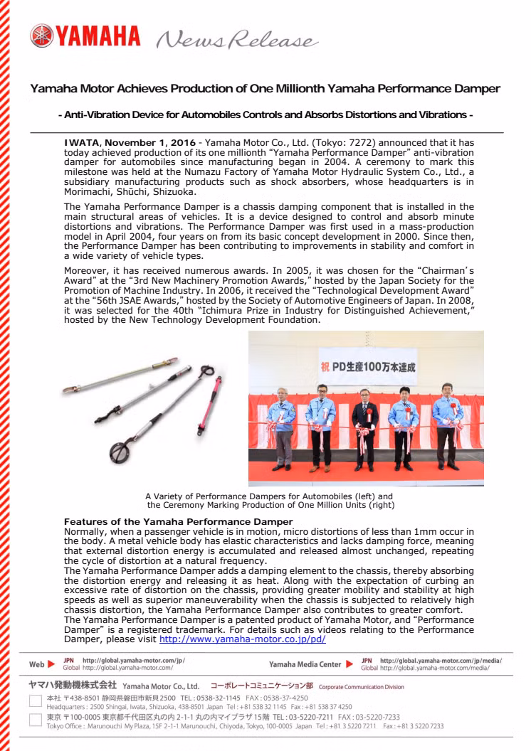 • Yamaha Motor Achieves Production of One Millionth Yamaha Performance Damper Yamaha Motor Achieves Production of One Millionth Yamaha Performance Damper