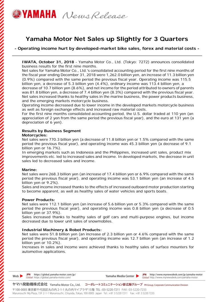 • Yamaha Motor Net Sales up Slightly for 3 Quarters - Operating income hurt by developed-market bike sales, forex and material costs -