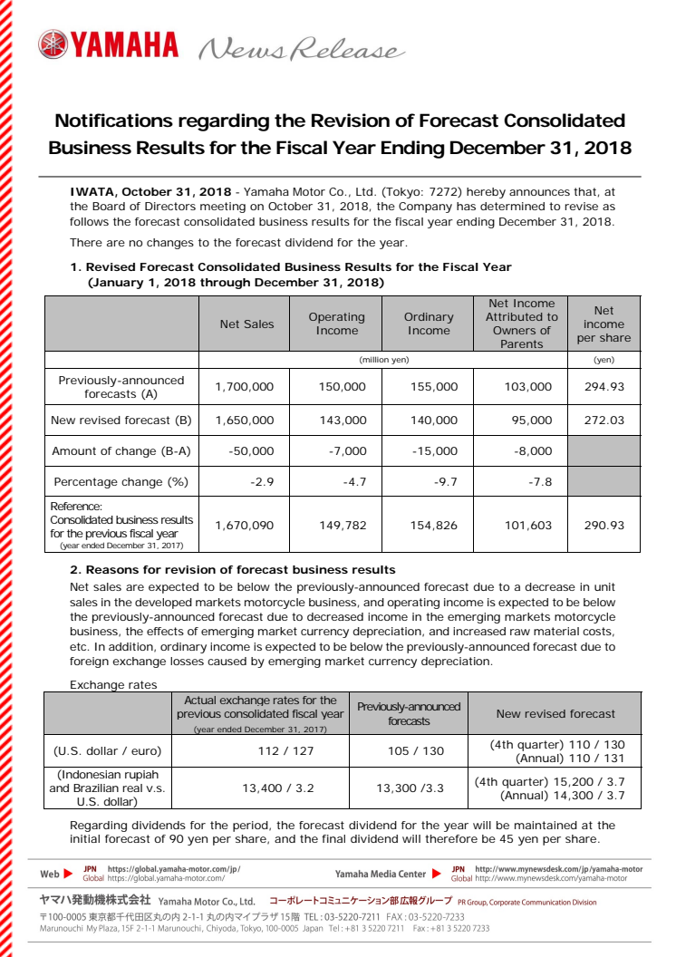 • Notifications regarding the Revision of Forecast Consolidated Business Results for the Fiscal Year Ending December 31, 2018