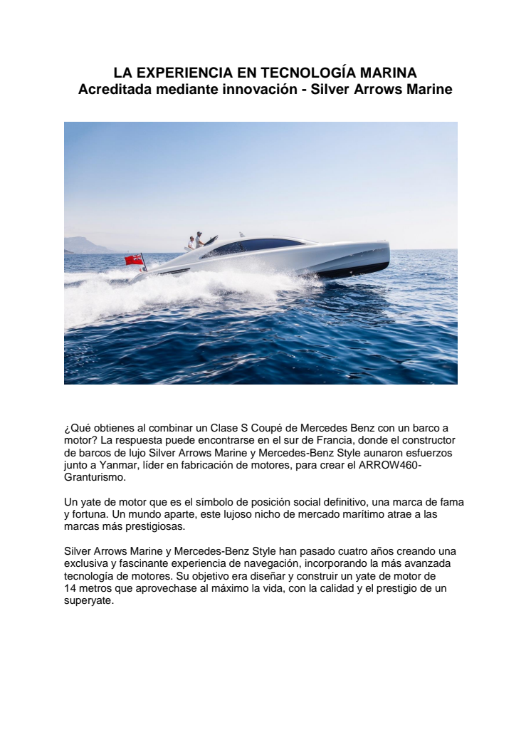 ¿Qué obtienes al combinar un Clase S Coupé de Mercedes Benz con un barco a motor? La respuesta puede encontrarse en el sur de Francia, donde el constructor de barcos de lujo Silver Arrows Marine y Mercedes-Benz Style aunaron esfuerzos junto a Yanmar, líder en fabricación de motores, para crear el ARROW460-Granturismo.