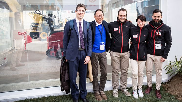 Marta Niccolini (second from right) with from left: Alessandro Belissima and Toyohiro Goto from Yanmar R&D Europe, and researchers Matteo Ragaglia and Alfredo Argiolas in front of the eFuzion concept at Bauma 2019.