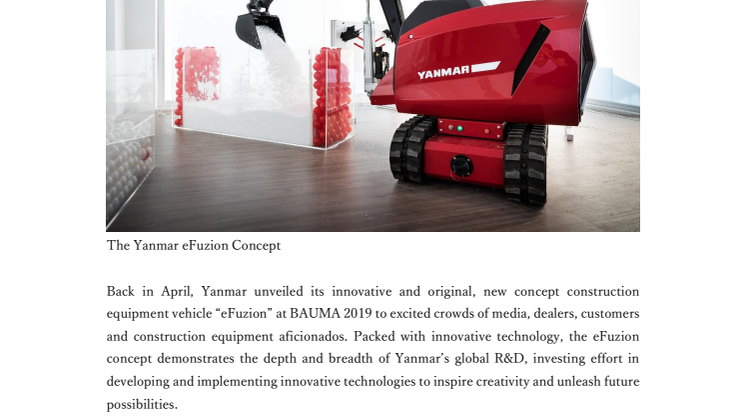 Back in April, Yanmar unveiled its innovative and original, new concept construction equipment vehicle “eFuzion” at BAUMA 2019 to excited crowds of media, dealers, customers and construction equipment aficionados. Packed with innovative technology, the eFuzion concept demonstrates the depth and breadth of Yanmar’s global R&D, investing effort in developing and implementing innovative technologies to inspire creativity and unleash future possibilities.