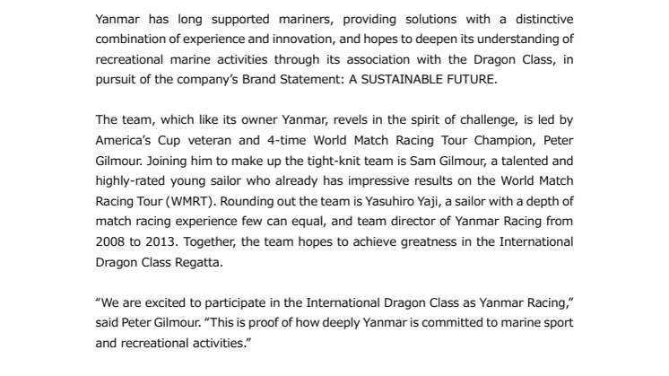 “We are excited to participate in the International Dragon Class as Yanmar Racing,” said Peter Gilmour. “This is proof of how deeply Yanmar is committed to marine sport and recreational activities.”