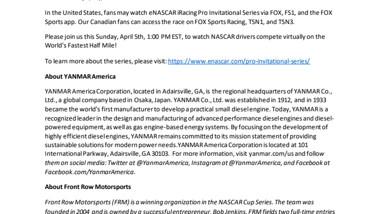 Adairsville, GA (April 1st, 2020): YANMAR America is proud to be the primary sponsor for the No. 38 Ford Mustang team and John Hunter Nemechek this weekend at the eNASCAR iRacing Pro Invitational Series. The virtual race will take place on the digitally recreated iconic NASCAR track, Bristol Motor Speedway, Sunday April 5th, 1:00 PM EST.