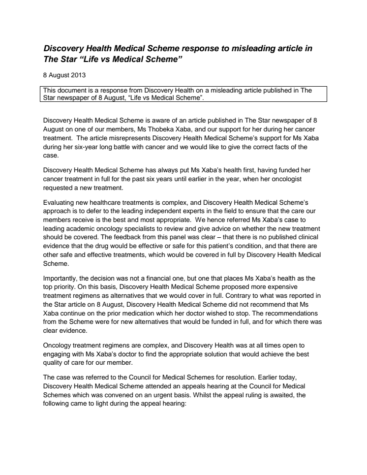 This document is a response from Discovery Health on a misleading article published in The Star newspaper of 8 August, “Life vs Medical Scheme”.