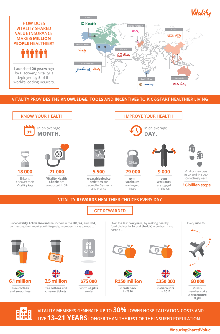 The Vitality business model leverages advances in behavioural economics to incentivize people to make healthier choices and dynamically rewards them for reducing their risk, in the form of premium reductions and other benefits. Vitality is now credited as a leading example of shared value in insurance, backed by clinical evidence that members are healthier, live longer and claim less.