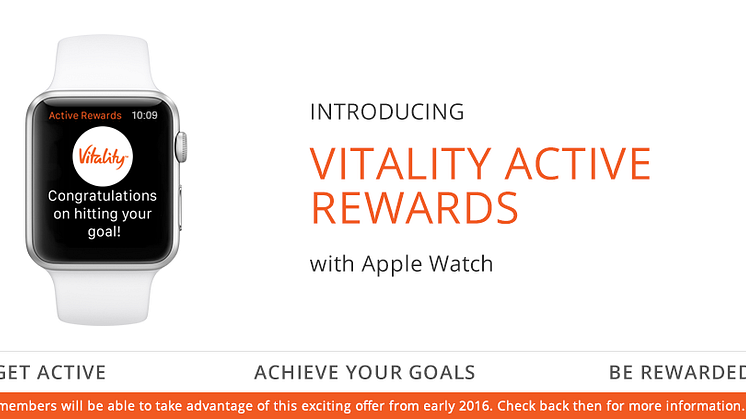 Discovery announced today the launch of Vitality Active Rewards with Apple Watch for use by Vitality and the Vitality network. This brings together the Vitality Rewards Program with Apple's groundbreaking health and fitness device, Apple Watch. Vitality Active Rewards with Apple Watch will enable Vitality members around the world to be motivated and encouraged to get more active and by achieving their goals, earn their Apple Watch and pay less for their health or life insurance.