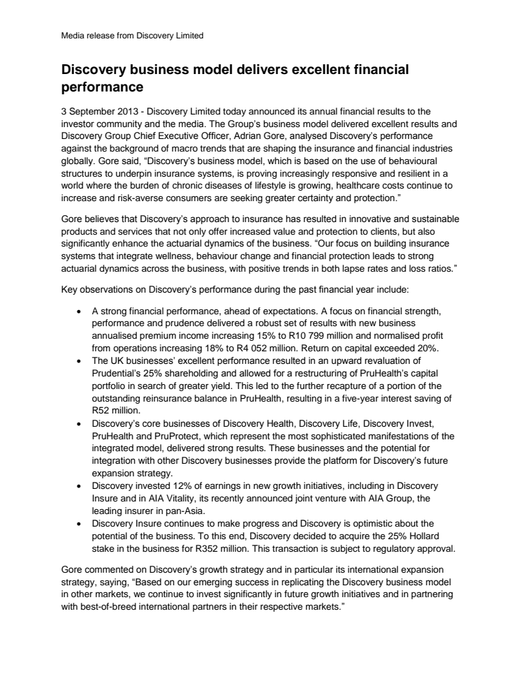 3 September 2013 - Discovery Limited today announced its annual financial results to the investor community and the media. The Group’s business model delivered excellent results and Discovery Group Chief Executive Officer, Adrian Gore, analysed Discovery’s performance against the background of macro trends that are shaping the insurance and financial industries globally. Gore said, “Discovery’s business model, which is based on the use of behavioural structures to underpin insurance systems, is proving increasingly responsive and resilient in a world where the burden of chronic diseases of lifestyle is growing, healthcare costs continue to increase and risk-averse consumers are seeking greater certainty and protection.”