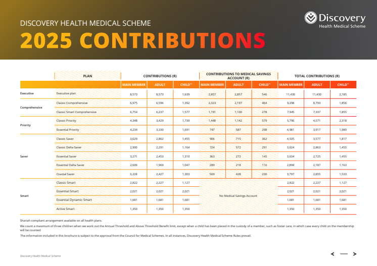 Discovery Health Medical Scheme 2025 contributions can be found here.