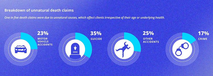 One in five death claims were due to unnatural causes, with the largest component attributed to suicide at a staggering 35%, followed by motor vehicle accidents at 23%.