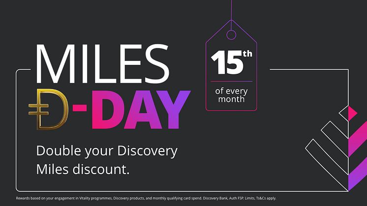 “We are extremely excited by the reach of Discovery Miles Đ-Day and how it really shows what shared-value banking is all about. Our first Discovery Miles Đ-Day was a tremendous success from the data and feedback we received. With Discovery Miles Đ-Day now a regular monthly feature offering clients up to 40% more value on every 15th day of each month, we are thrilled to enhance the lives of all our clients through even better tangible rewards for adopting behaviours that improve health, driving and financial wellbeing,” concludes Kallner.