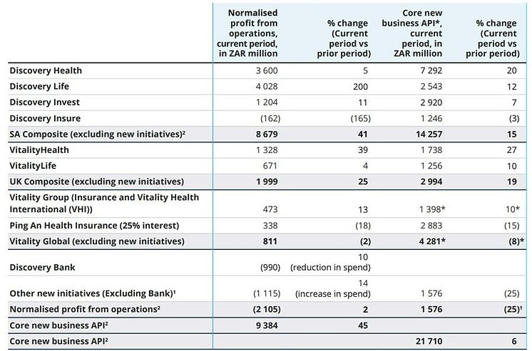 2. Includes SA Vitality:normalised profit from operations includes R9 million (prior period: R43 million); core new business API includes R256 million (prior period: R24 million)