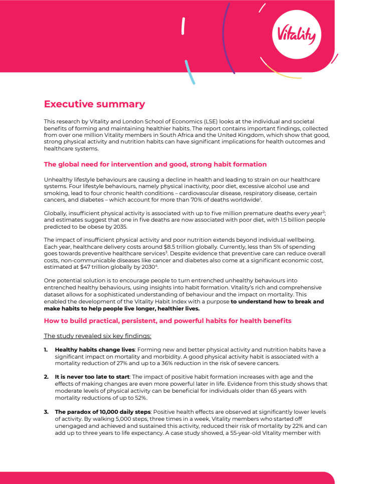 · Research conducted by Vitality and the London School of Economics, covering over one million Vitality members across South Africa and the United Kingdom, finds enormous health benefits from habitual physical activity, even at low volumes.